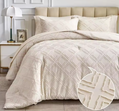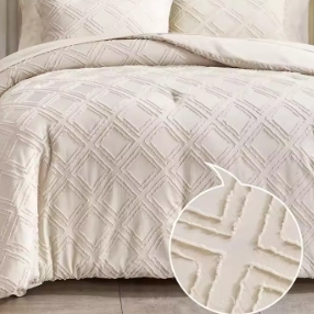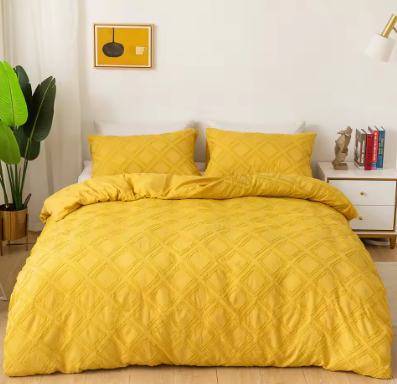 This All Seasons Embroidered Tufted Bedding Set is made of 100% polyester fabric, ensuring softness and comfort. It features a luxurious solid color quilt design with jacquard tufted details, perfect for home & hotel use in all seasons. The bedding set offers customization options for color and design, catering to personalized preferences.Available in multiple sizes including Twin, Queen, King or customized. It provides versatility for different bed dimensions.The comforter is crafted with a jacquard tufted design. This technique not only adds a touch of elegant texture but also ensures that the fill remains evenly distributed, preventing clumping and guaranteeing consistent warmth and comfort night after night.
