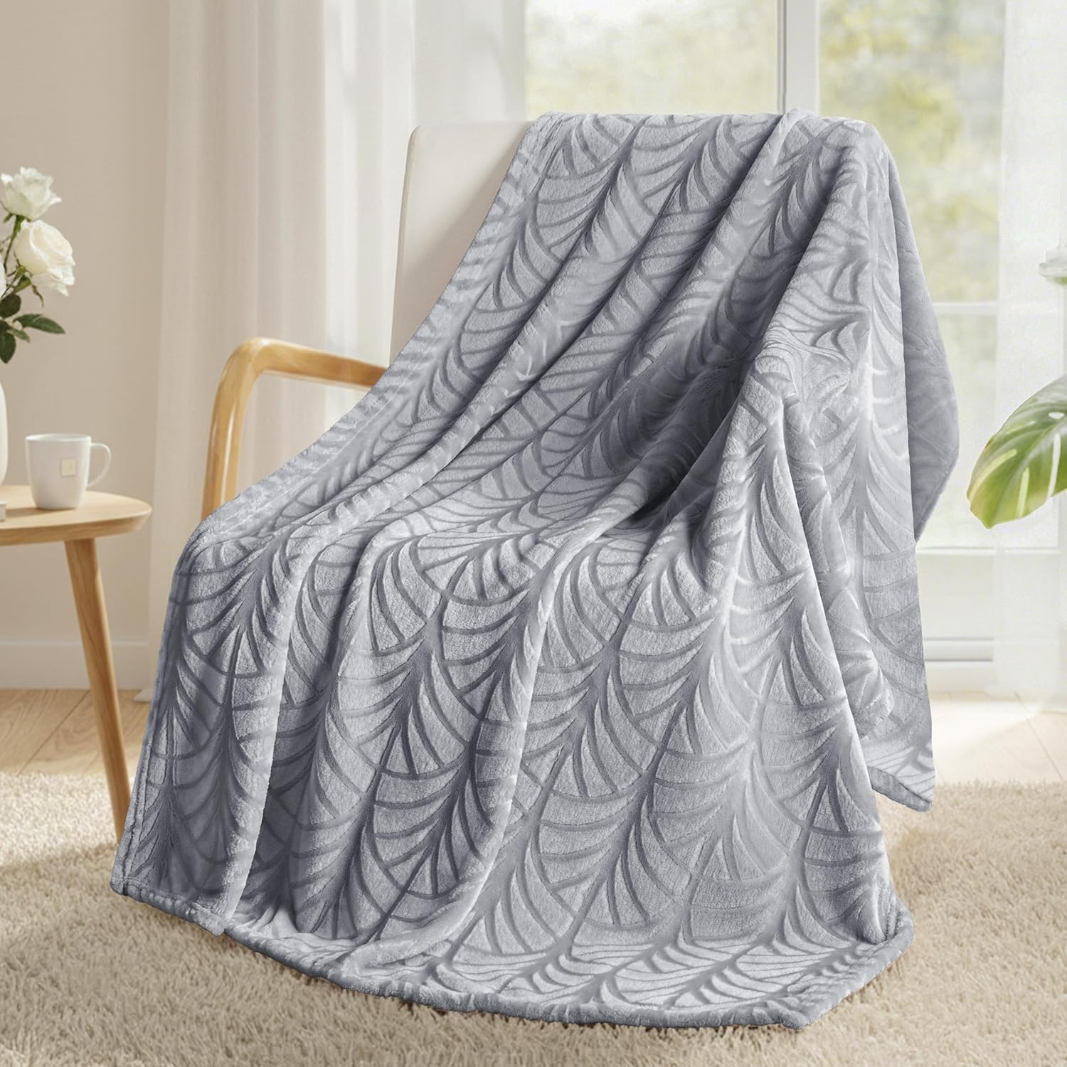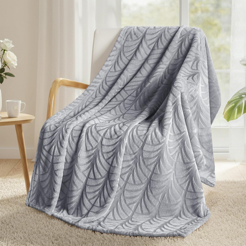 Embossed Flannel Fleece Throw Blanket Botanical Leaf Pattern Soft Plush Textured Cozy Decorative Sofa Blanket-Gray