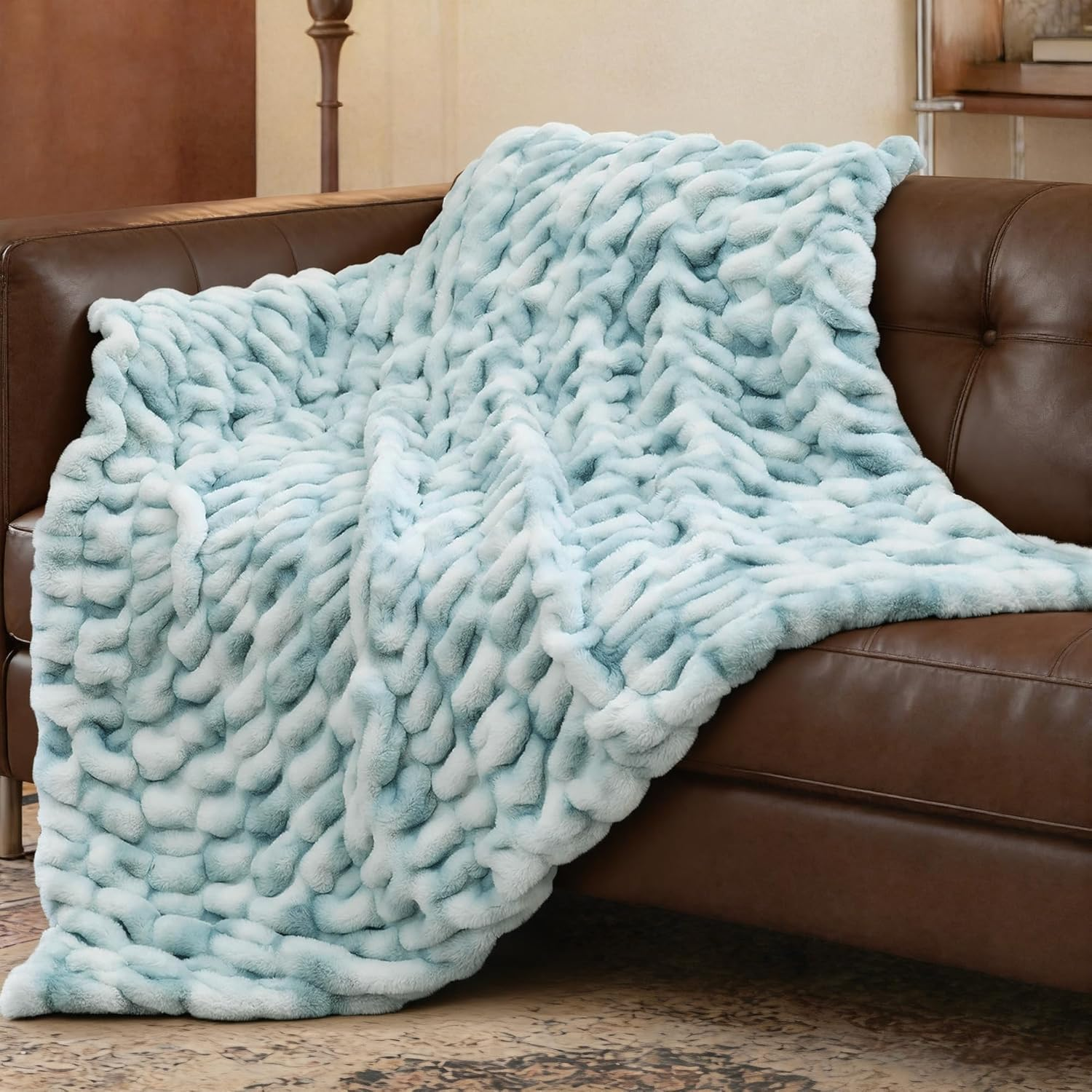 Home » Products » Ultra Soft Luxury Faux Fur Throw Blanket for Couch, Fuzzy Fluffy Plush Warm Cozy Ruched Blanket for Sofa Bedroom Living Room, Elegant Gift Idea for Women (50"x60",Tie-dye Freshwater Blue)