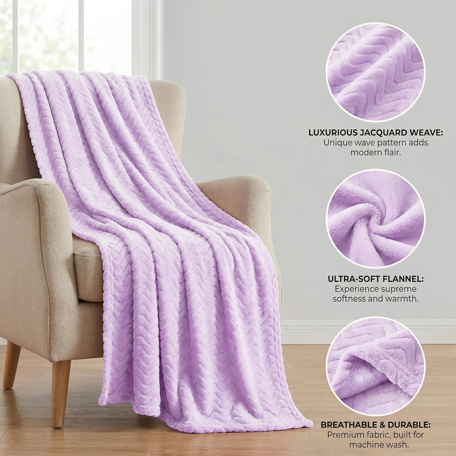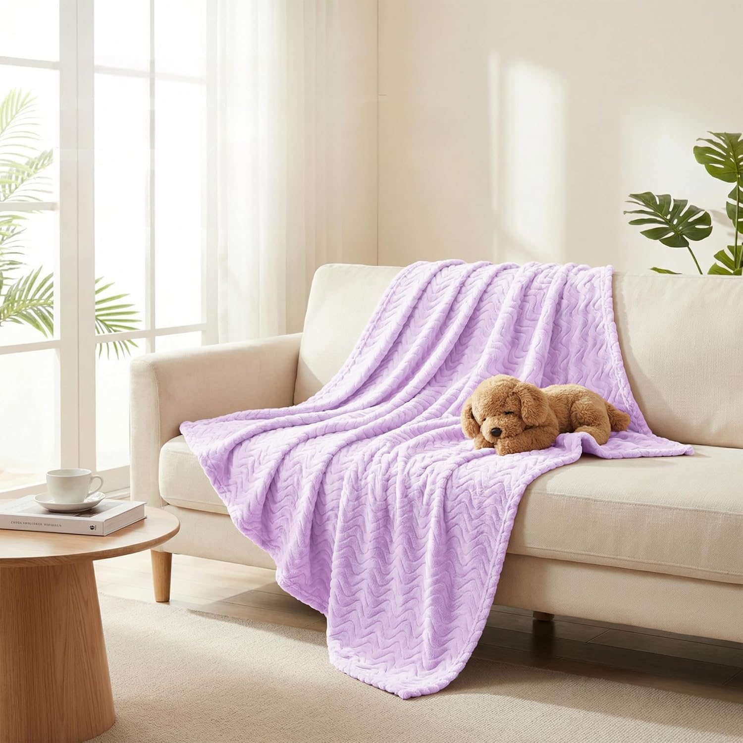 Wave Pattern Embossed Flannel Throw Blanket Soft Plush Textured Cozy Decorative Sofa Couch Blanket-Purple